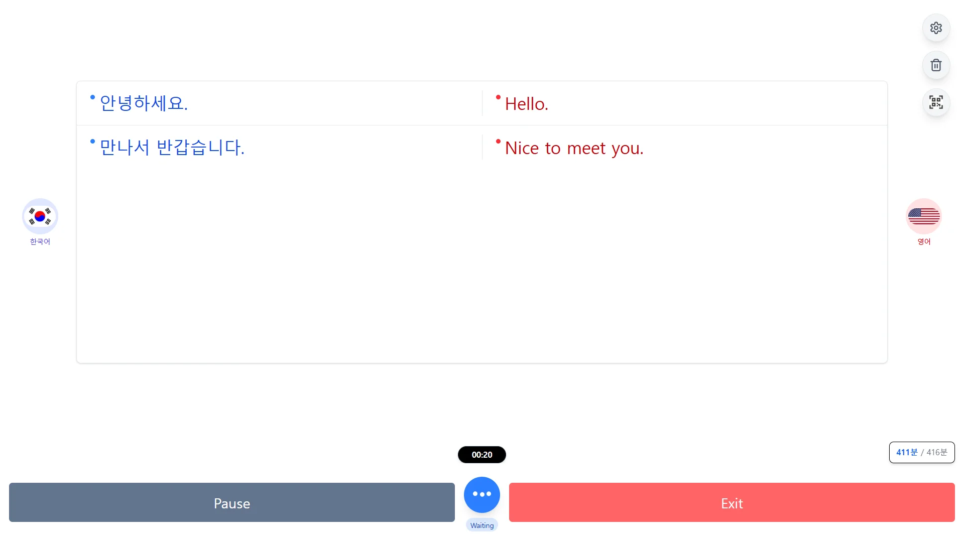 발표자나 강의가 바뀌어 새로운 내용만 보이게 하고 싶은데 종료 후 재시작하기 번거로우셨다고요? 이제 기존 발화 내용을 지우고, 일시정지를 했다가 재시작 해보세요🗑️ 통역창을 나가지 않아도 화면을 정리한 뒤 새로 시작할 수 있습니다.