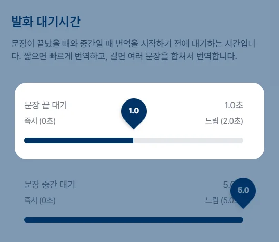 여러 문장을 발화할 때 문장 별로 구분하는 대기시간입니다. 발화 속도가 빠를 때 여러 문장을 계속 이야기하면 받아쓰기만 작동하던 현상을 개선했습니다👍 이 시간을 짧게 설정하면 문장과 문장 사이 생기는 공백 시간이 짧아도 문장을 구분 지어주는 기능입니다.