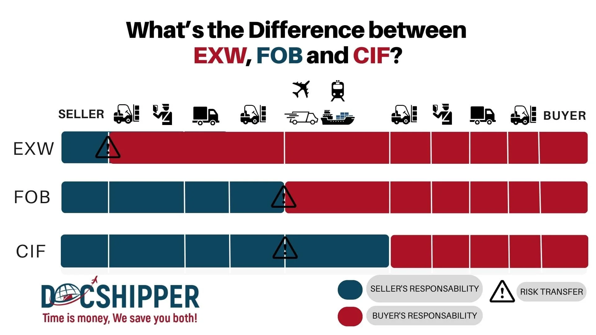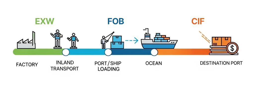 EXW/FOB/CIF는 가장 널리 사용되는 세 가지 조건으로, 조건에 따라 매도인의 책임 범위가 달라집니다.