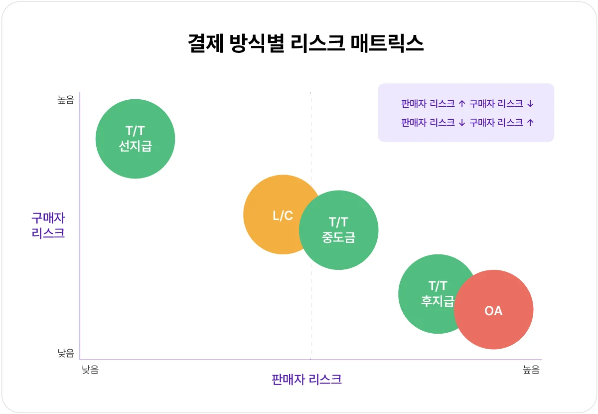 신뢰 관계가 형성되지 않은 초기 거래에서는 은행이 중간에서 보증하는 L/C가 양측 모두에게 안전합니다. 비용 부담이 크다면 계약금 30%를 선지급 받고, 선적 전 잔금 70%를 받는 방식으로 리스크를 분산할 수 있습니다.