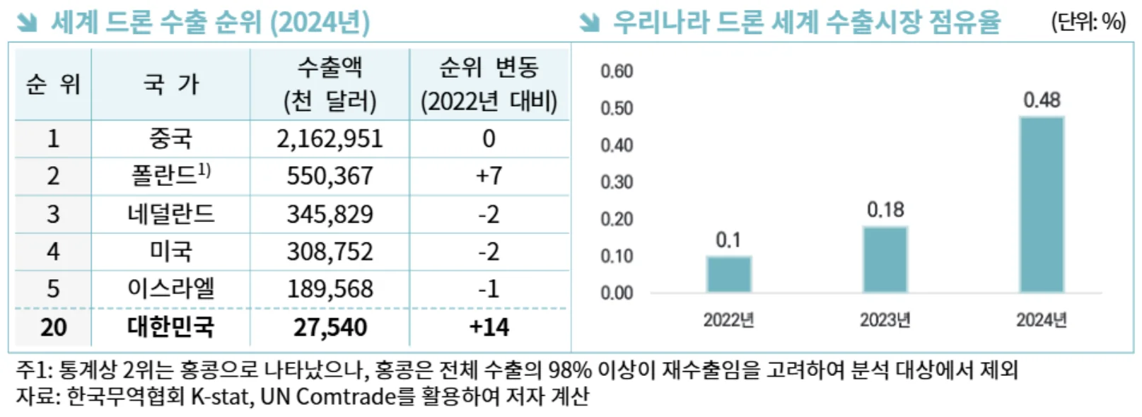 한국무역협회 보고서에 따르면, 세계 드론 시장이 2022년 24억7000만 달러에서 2024년 61억1000만 달러로 2년간 2배 이상 급성장했지만, 한국의 수출 시장 점유율은 0.48%에 불과하며 수출 순위는 20위에 머물렀습니다.