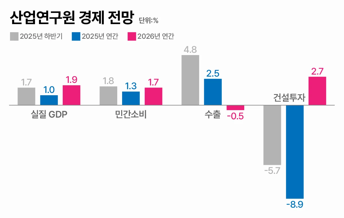 산업연구원은 2026년 한국 경제성장률을 1.9%로 전망했습니다. 상반기 2.2%, 하반기 1.5%로 점차 둔화될 것으로 예상됩니다.